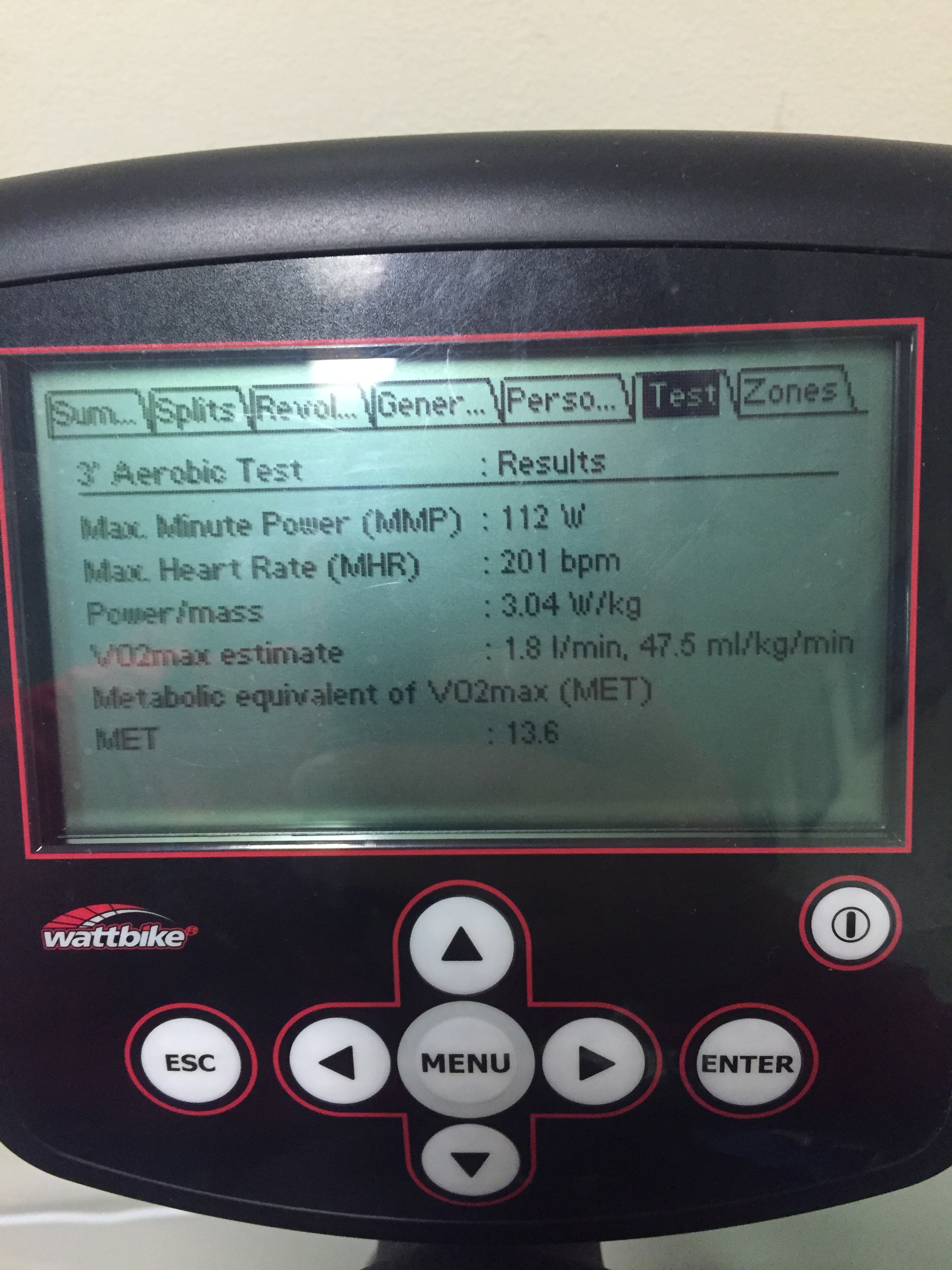 Watt Bike training session shows increase in VO2max, Power/mass and lower Max. Heart Rate since last testing session.
