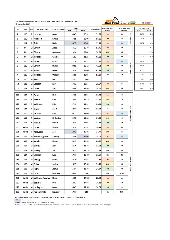 5th November 2017 – Ski MK Race Team – Internal Race Series 2017-18 – Race 1 @ Snozone MK