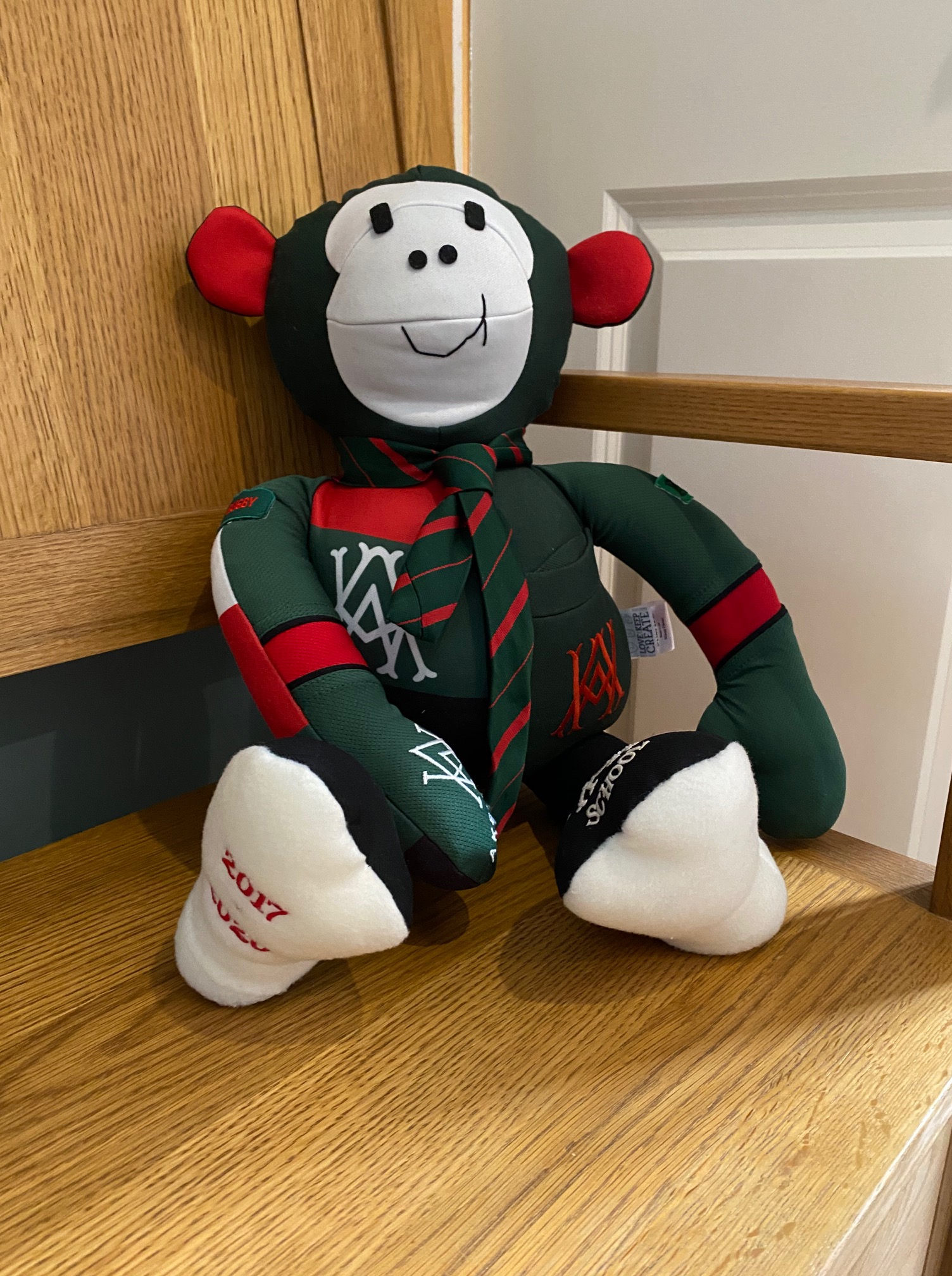 This is an amazing way to keep school memories, having uniform, sporting colours and school tie made into a a cheeky monkey. When I get home, need to dig out all my school pins and add them to Monkey.
