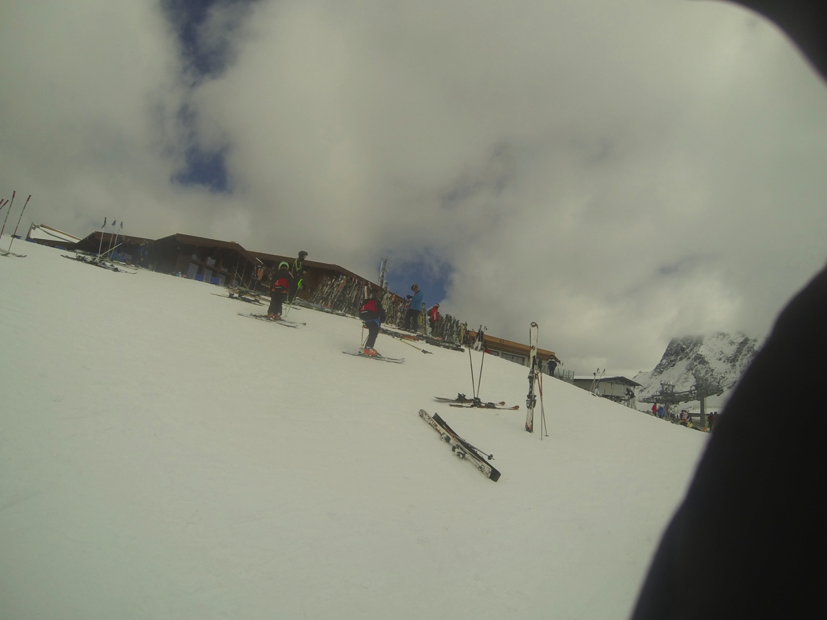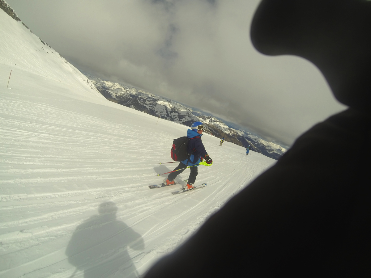 7th April – Day 2 – Monday – 7am wake up call, breakfast and onto the glacier. Conditions were amazing today, with glorious sunshine and fast hard packed pistes. Today we worked hard on fast steep (actually very steep) GS turns and keeping the speed high but in controlled GS turns.