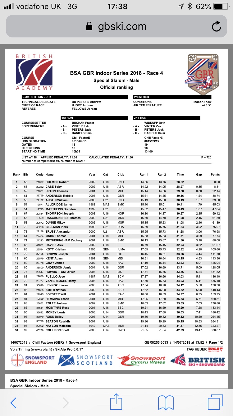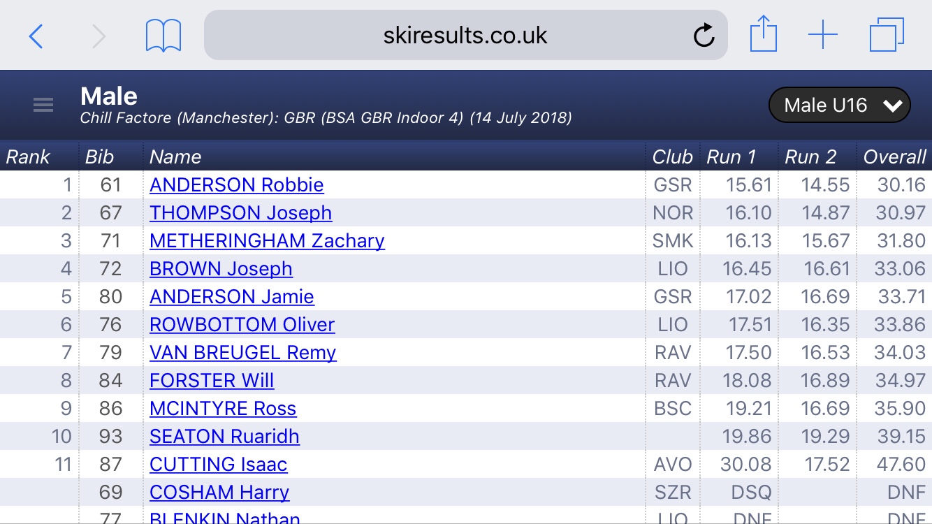 I finished 1st U16 but jumped from 3rd to 2nd overall, beaten only by a very good Manchester based Under 18 skier.